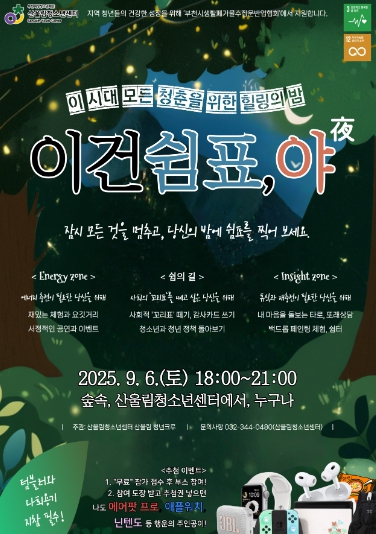 이번 행사는 산울림청소년센터 대표 환경 축제인 [숲속의 행복나눔축제]의 일환으로, 소속 청년 모임‘산울림 청년크루’가 기획에 참여하고 운영하는 청년 주도형 프로젝트다. ‘낙오자’, ‘어린애’ 등 사회가 붙여준 ‘꼬리표’를 잠시 내려놓고, 온전한 자신만의 ‘쉼’을 찾자는 취지로 기획됐다. 고요한 숲속 센터의 자연환경을 배경으로 다양한 힐링 프로그램을 통해 서로를 위로하고 응원하는 데 중점을 둔다.