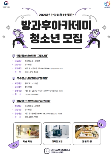 [파이낸셜경제=김기보 기자] 안양시청소년재단은 공공 청소년 돌봄 사업인 청소년방과후아카데미의 2026년도 참여 청소년을 모집한다.