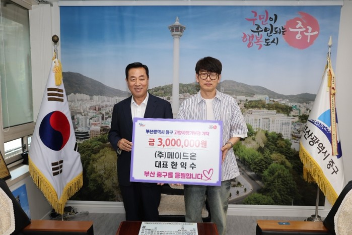 한익수 ㈜메이드온 대표는 오는 7월 26일 부산항 제1부두에서 개최되는 워터밤 부산2025 행사의 공연 기획사 대표로서 축제 수익금의 일부를 고향사랑기부금으로 전달하며 중구를 응원하는 마음을 전했다.