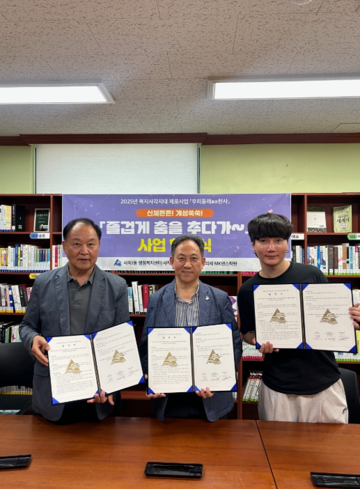 [파이낸셜경제=박영진 기자] 부산 동래구 사직1동은 지난 26일 사직1동 지역사회보장협의체(위원장 조정래), MK댄스학원(대표 현철민)과 신체튼튼! 개성쑥쑥! 즐겁게 춤을 추다가~사업 관련 협약을 체결했다고 밝혔다.