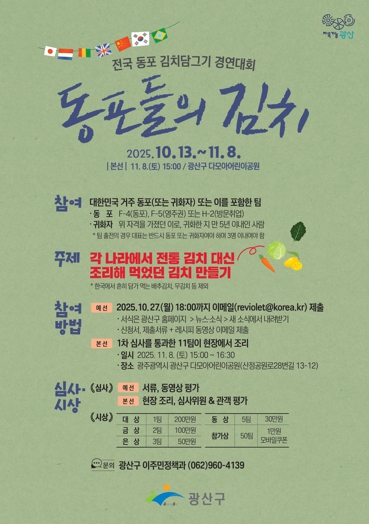 [파이낸셜경제=김예빈 기자] 광주 광산구가 13일부터 11월 18일까지 전국 곳곳에 거주하고 있는 동포들을 대상으로 ‘전국 동포 김치담그기 경연대회_동포들의 김치’를 개최한다.