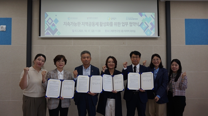 [파이낸셜경제=김영란 기자] 제주연구원(원장 유영봉) 제주사회복지연구센터(센터장 오윤정)는 2025년 10월 17일, 지속가능한 지역공동체 활성화를 위해 제주특별자치도 지속가능발전협의회, 일배움터, 제주특별자치도 마을만들기종합지원센터와 업무협약을 체결했다.