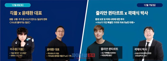 또한 수소에 대한 궁금증을 풀어줄‘수소 토크 콘서트’가 12월 6일(토)부터 7일(일)까지 양일간 열린다. 6일에는 공학 유투버‘수드래곤’과 루트에너지 윤태환 대표가 참여해‘수소로 돌아가는 일상’을 주제로, 수소가 생활·교통·주거·가격 등 일상 전반에서 어떤 현실적인 변화를 만들어낼 수 있는지에 대해 논의한다. 7일에는 벨기에 출신 방송인이자 EU 기후행동 친선대사 줄리안 퀸타르트와 숭실사이버대학교 환경안전공학과 곽재식 박사가 수소의 가치와 지속가능한 미래에 대해 다양한 관점의 의견을 나눌 예정이다.