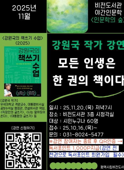 [파이낸셜경제=김기보 기자] 평택시 비전도서관은 오는 11월 20일 저녁 7시 '강원국의 책 쓰기 수업'의 강원국 작가를 초청하여 ‘모든 인생은 한 권의 책이다’를 주제로 야간 인문학 강연을 진행한다.