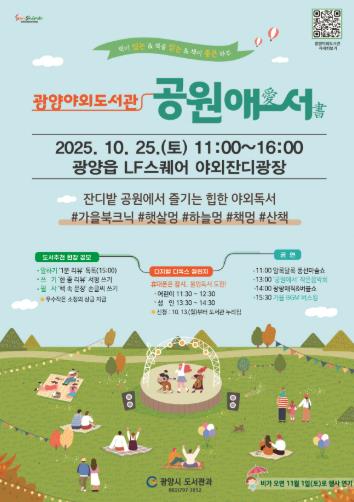 [파이낸셜경제=김예빈 기자] 광양시는 오는 10월 25일 광양읍 LF스퀘어 잔디밭공원에서 자연과 책이 어우러진 『광양 야외도서관–공원애愛서書』 행사를 연다고 밝혔다.