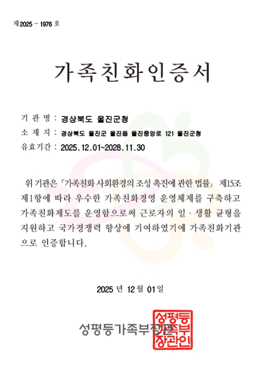 [파이낸셜경제=김지훈 기자] 울진군은 성평등가족부가 주관하는 2025년 가족친화 인증 심사에서 우수한 평가를 받아‘가족친화 재인증’을 획득했다.