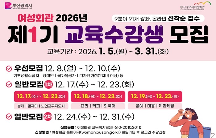 [파이낸셜경제=박영진 기자] 부산시 여성회관은 내일(8일)부터 '2026년 제1기 교육과정' 수강생을 모집한다고 밝혔다.