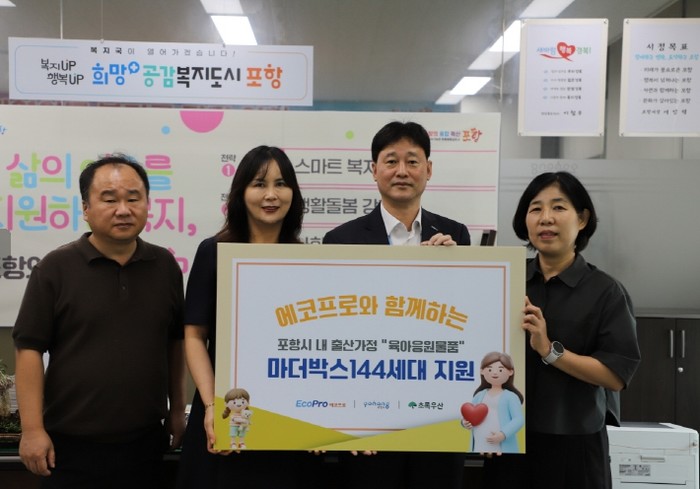 [파이낸셜경제=김지훈 기자] 포항시는 지난 25일 에코프로가 시청을 방문해 저출산 극복에 힘을 보태고, 지역 내 저소득 출산 가정을 지원하기 위해 ‘마더박스’ 144세트(3,600만 원 상당)를 기탁했다고 밝혔다.