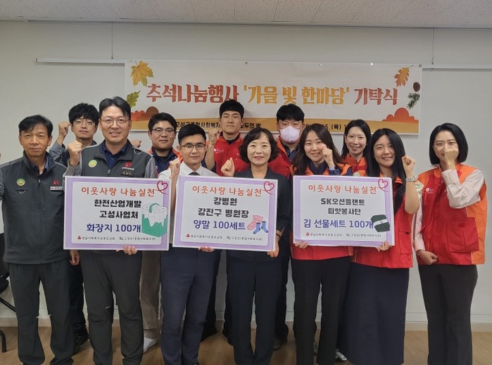 한전산업개발(주) 고성사업처에서는 어르신들의 일상생활에 꼭 필요한 화장지 100세트를, SK오션플랜트 띠앗봉사단에서는 추석맞이 김 선물세트 100개를 정성껏 준비해 전달했다.