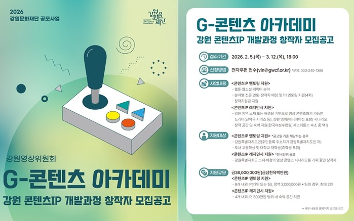 [파이낸셜경제=조성환 기자] 강원문화재단은 도내 콘텐츠 창작자 발굴과 지역 콘텐츠 산업 활성화를 위해 2026년 G-콘텐츠 아카데미 '강원 콘텐츠IP 개발과정' 참여 창작자를 공개 모집한다고 밝혔다.