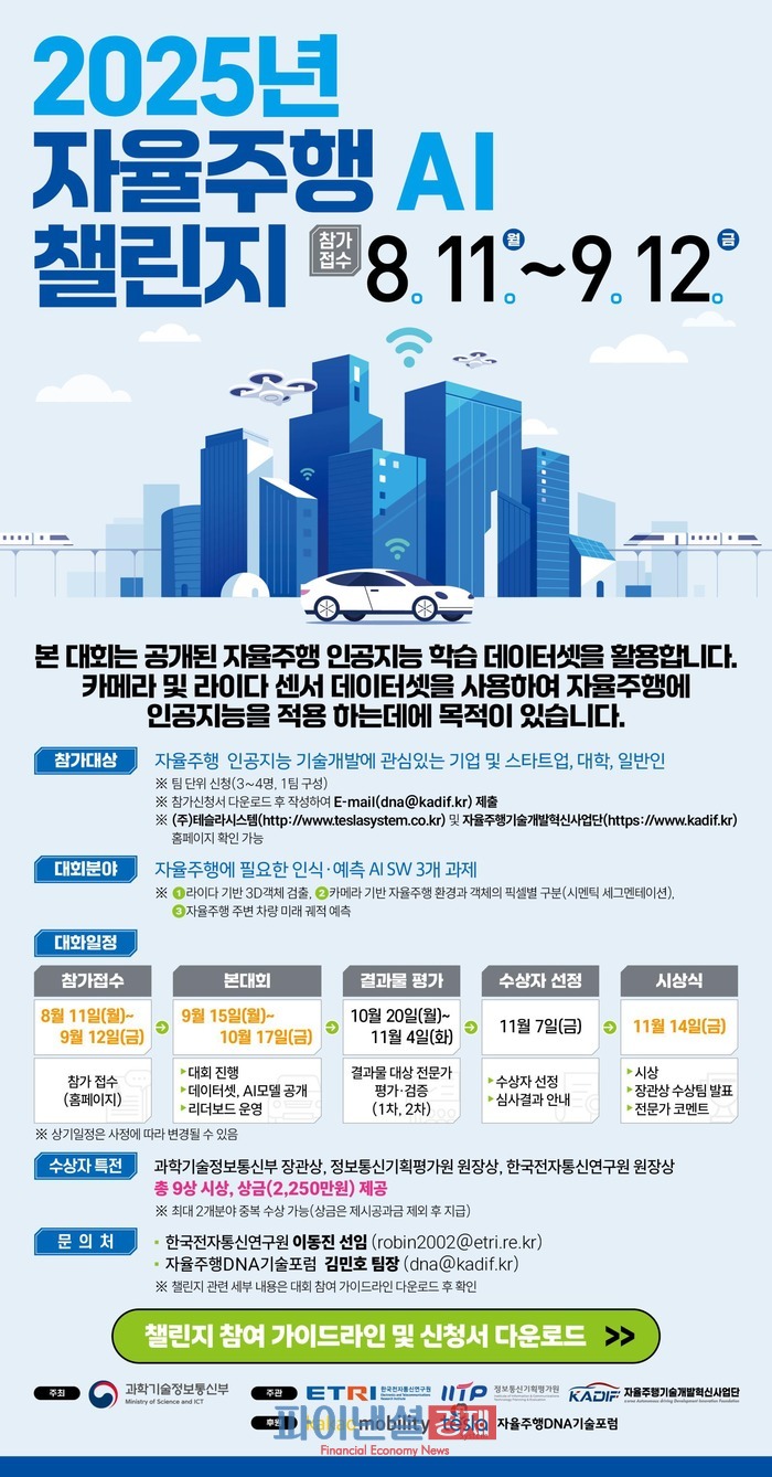 [파이낸셜경제=박영진 기자] 과학기술정보통신부(장관 배경훈, 이하 ‘과기정통부’)는 정부 사업을 통해 구축한 자율주행 인공 지능 모형(AI 모델)과 데이터 활용을 촉진함으로써 연구 성과를 확산하고 자율주행 생태계를 육성하기 위한 「2025 자율주행 인공 지능 경진대회(AI 챌린지)(이하 ‘경진대회(챌린지)’)」의 참가자를 오는 8월 11일(월)부터 9월 12일(금)까지 모집한다.
