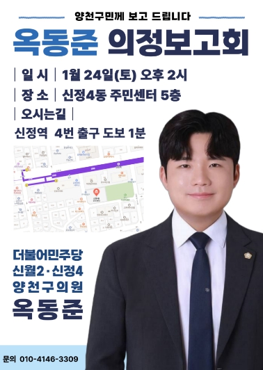 [파이낸셜경제=김예빈 기자] 양천구의회 옥동준 의원(더불어민주당, 신정4·신월2동)이 오는 24일 오후 2시 양천구 신정4동 주민센터에서 의정보고회를 열어 그간의 의정활동 성과와 향후 계획을 양천구민께 보고하는 자리를 마련한다.