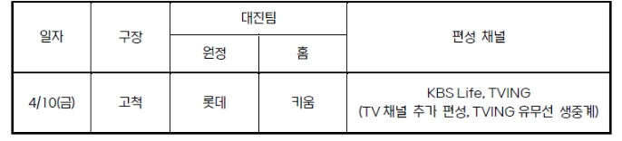 [파이낸셜경제=금윤지 기자] 오는 4월 10일(금) 오후 6시 30분부터 고척에서 열리는 KBO 리그 롯데-키움의 경기가 KBS Life 채널에 편성돼 생중계될 예정이다.
