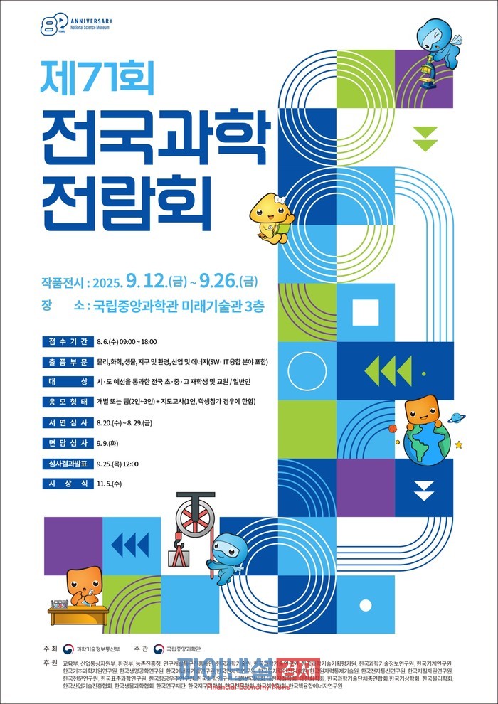 제71회 전국과학전람회는 서면심사(8월 20일(수)~29일(금))를 시작으로 면담심사(9월 9일(화))를 통해 대통령상 2점, 국무총리상 2점 등 총 300여 점의 작품에 대한 시상을 확정할 예정이며, 9월 12일(금)부터 9월 26(금)까지 총 15일간 국립중앙과학관 미래기술관 3층에서 전국대회 출품작 전시가 진행된다.