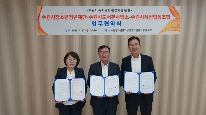 [파이낸셜경제=김기보 기자] 수원시청소년청년재단은 수원시도서관사업소, 수원시서점협동조합과 4월 17일 수원청소년문화센터에서 수원시 독서문화 활성화를 위한 업무협약을 체결했다.