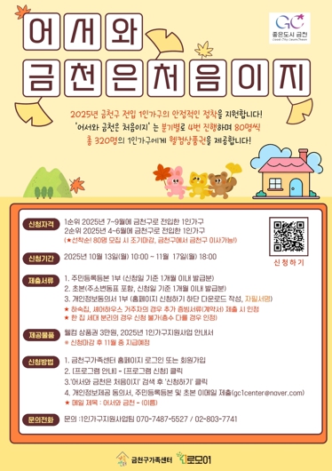 참가 신청은 금천구청 누리집, 1인가구 누리집, 금천구 가족센터 누리집, GS25 내 1인가구 지원사업 홍보존 ‘1인가구 나랑노랑’ QR코드를 통해 진행할 수 있다.