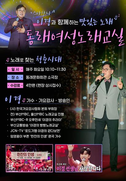‘동래여성노래교실’은 가수이자 방송인인 이경의 진행으로 건전가요, 민요, 트로트 등 다양한 장르의 노래를 배우며 주민들 간의 소통과 활력을 도모하는 프로그램이다.