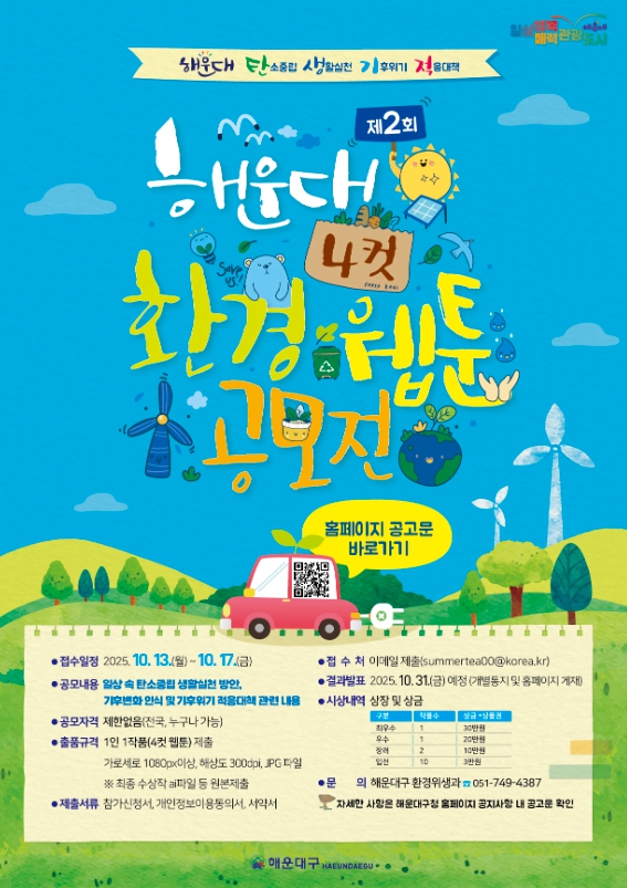 [파이낸셜경제=박영진 기자] 해운대구는 기후위기 대응과 탄소중립 실천 문화를 확산하기 위해 ‘제2회 해운대 환경 4컷 웹툰 공모전’을 개최한다.
