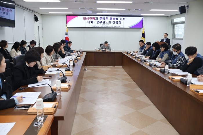 [파이낸셜경제=박영진 기자] 부산광역시 남구의회는 2월 11일 남구의회에서 전국공무원노동조합 부산지역본부 남구지부와 간담회를 개최했다.