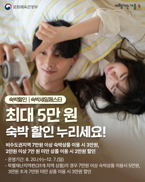 - 특별재난지역편(31개 지역 상품)의 경우 7만 원 이상 숙박상품 이용시 5만 원, 3만 원 초과 7만 원 미만 상품 이용 시 3만 원 할인→숙박세일페스타 안내페이지