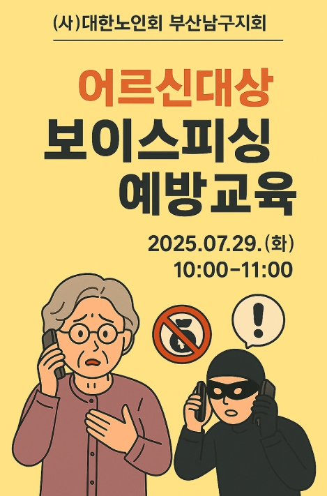 [파이낸셜경제=박영진 기자] 부산광역시 남구는 개청 50주년을 맞아 BNK부산은행과 함께 오는 7월 29일 오전 10시, (사)대한노인회 부산남구지회에서 어르신들을 위한 보이스피싱 예방 교육을 개최한다고 밝혔다.