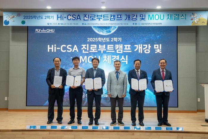 [파이낸셜경제=김예빈 기자] 경상국립대학교(GNU·총장 권진회) 우주항공대학(CSA·학장 허기봉)은 9월 12일 가좌캠퍼스 항공우주산학협력관(407동)에서 2025학년도 2학기 ‘Hi-CSA 진로부트캠프’ 개강 및 MOU 체결식을 진행했다.