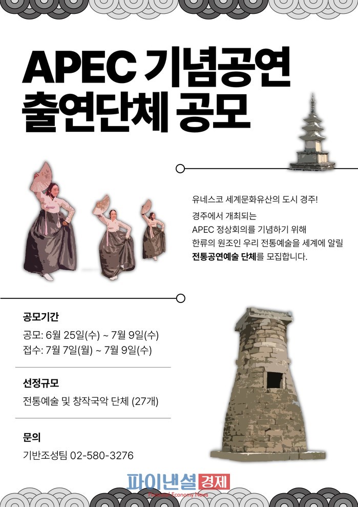 한류의 뿌리인 한국 전통예술의 우수성을 전 세계에 알리는 자리가 될 2025 경주 APEC 기념공연 출연단체 공모 접수는 7월 7일부터 9일까지 3일간 진행된다. 자세한 내용은 전통공연예술진흥재단 누리집 에서 확인할 수 있다.