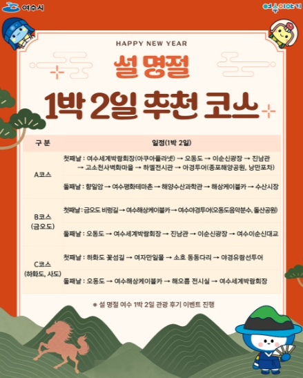 | ▲ 여수시가 설 명절 연휴를 맞아 가족 단위 관광객과 귀성객을 대상으로 대표 관광지를 연계한 체류형 1박 2일 코스를 홍보하고 이벤트를 진행한다. |