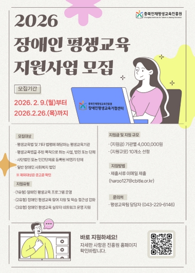 | ▲ 충북인재평생교육진흥원, 2026년 충청북도 장애인 평생교육 지원사업 홍보포스터 |