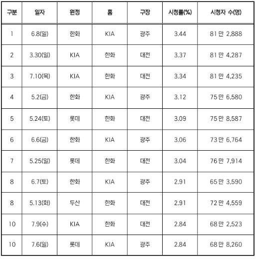 | ▲ 2025 KBO 리그 전반기 시청률 TOP 10 경기 |