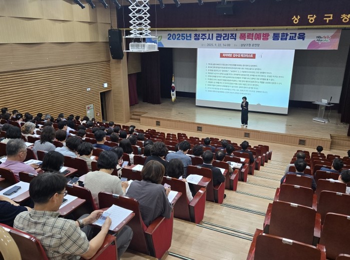 [파이낸셜경제=김기보 기자] 청주시는 22일 상당구청 대공연장에서 시 기관장과 고위직 공무원 185명을 대상으로 직장 내 4대 폭력(성희롱,성매매,성폭력,가정폭력) 예방 통합교육을 실시했다.