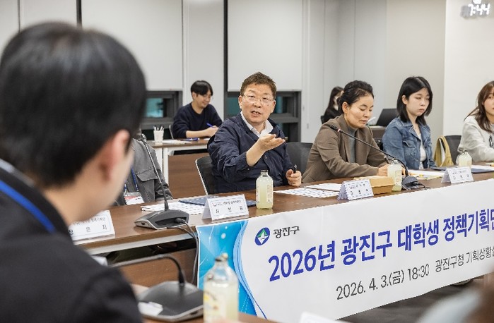 | ▲ 지난 3일 광진구청 기획상황실에서 진행된 ‘2026년 대학생 정책기획단 발대식’에서 김경호 광진구청장이 청년들과 대화하고 있다. |