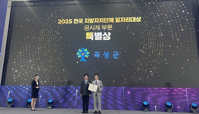 | ▲ 2025년 전국 지방자치단체 일자리대상에서 특별상을 받는 모습 (좌 김영훈 고용노동부 장관, 우 곡성군 정창모 부군수) |
