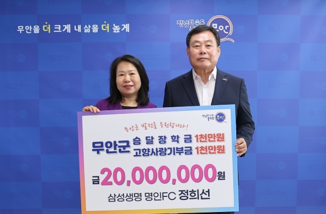 [파이낸셜경제=김예빈 기자] 전남 무안군은 1일 삼성생명 정희선 명인FC가 지역 인재 양성과 지역 발전을 위해 소중히 써달라며 승달장학금 및 고향사랑기부금 각 1천만 원, 총 2천만 원을 기탁했다고 밝혔다.