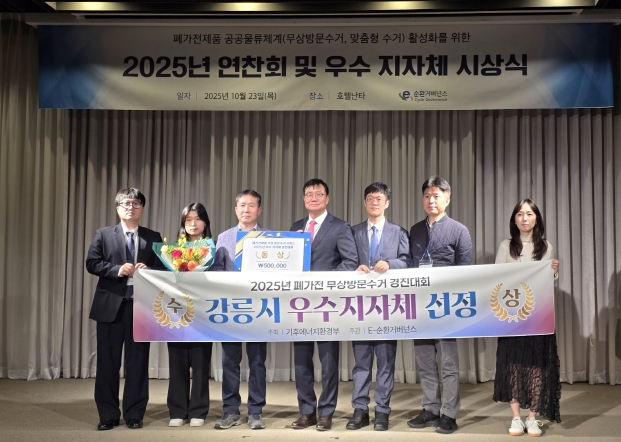 [파이낸셜경제=조성환 기자] 강릉시는 지난 6월 세계 환경의 날을 맞이하여 자원순환 및 재활용 활성화에 기여한 공로로 ‘환경보전 유공 국무총리 단체표창’을 수상하는데 이어, 23일 기후에너지환경부가 주최하는 '2025년 폐가전 무상수거처리 전국 지자체 경진대회'에서 ‘동상’을 수상하여 기후에너지환경부장관 단체표창을 받는 쾌거를 이뤘다.