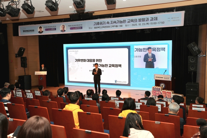 윤건영 교육감은 “기후위기는 더 이상 과학의 문제가 아니라 삶과 교육의 문제”라며, “이번 포럼을 통해 충북의 학교들이 생태적 감수성과 지속가능한 삶의 태도를 키워가는 미래교육의 중심으로 나아가길 기대한다.”라고 밝혔다.