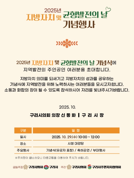 [파이낸셜경제=김기보 기자] 구리시의회는 오는 10월 29일에 구리시청 1층 대강당에서 ‘2025년 지방자치 및 균형발전의 날 기념식’을 개최한다.