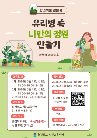 [파이낸셜경제=김기보 기자] 충청북도 정원교육센터는 도민들이 식물과 교감하며 정원문화를 일상에서 즐길 수 있도록 ‘반려식물 만들기(유리병 속 나만의 정원 만들기)’ 교육을 오는 3월 11일과 18일 총 2차례에 걸쳐 운영한다.
