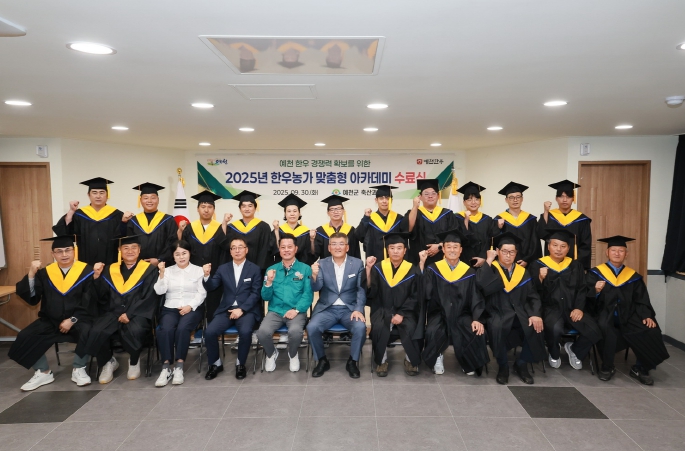 [파이낸셜경제=김지훈 기자] 예천군은 30일 오후 4시, 단샘어울림센터 회의실에서 한우농가 30명이 참석한 가운데 2025년 ‘예천한우 맞춤형 아카데미 수료식’을 개최했다. 이번 수료식에는 김학동 군수도 함께해 수료자들을 격려했다.