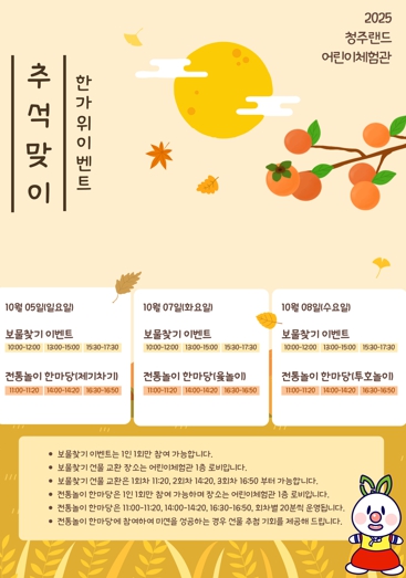 본격적인 추석 연휴 기간인 10월 5일부터 8일까지는 어린이체험관에서 어린이를 위한 보물찾기, 전통놀이 등 다양한 꿀잼 이벤트를 진행한다.