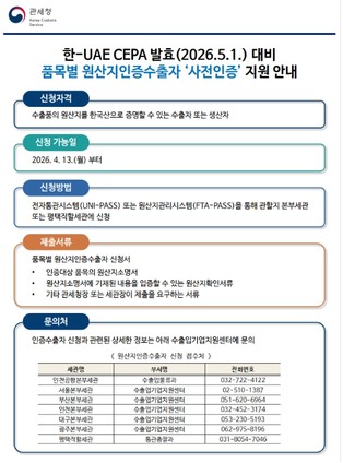 △(한-아랍에미리트연합국(UAE) 포괄적 경제동반자 협정(CEPA) 활용 지원) 중동 아랍권 국가와 처음 체결하는 협정으로, 아랍에미리트연합국(UAE) 협정을 우리 수출기업들이 발효 첫날(5.1.)부터 즉시 활용할 수 있도록, 4월 13일(월)부터 품목별 원산지인증수출자 ‘사전인증’ 신청을 받을 예정이다. 이번 신규 협정 체결로 아랍에미리트연합국(UAE) 내 케이(K)-가전·뷰티 등 주력 수출품목 등 중동지역 수출확대는 물론 부족한 원유수급 원활화에도 큰 도움이 될것으로 기대됨에 따라 수출기업 원산지증명서 신속 발급 등 아랍에미리트연합국(UAE) 수출입기업의 협정 활용을 적극 지원할 예정이다.