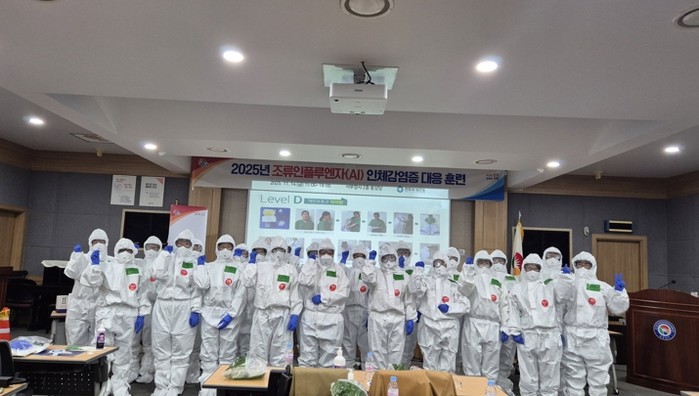 교육강연은 권정훈 경북대 수의학과 교수를 초빙해 ‘AI 인체감염증 대응’에 대한 주제로 진행됐다. 이후 가금류 농장에서 ▲고병원성 AI 확진에 따른 살처분 실시 상황 ▲살처분 인력(고위험군) 관리 중 AI 인체감염증 의사환자 발생 ▲확진사례 발생에 따른 국가지정 치료병상 입원상황 등을 가정한 역할극을 시연했으며, AI 대응관련 OX퀴즈, 개인보호구 착·탈의 실습 등 실질적인 대응훈련을 실시했다.