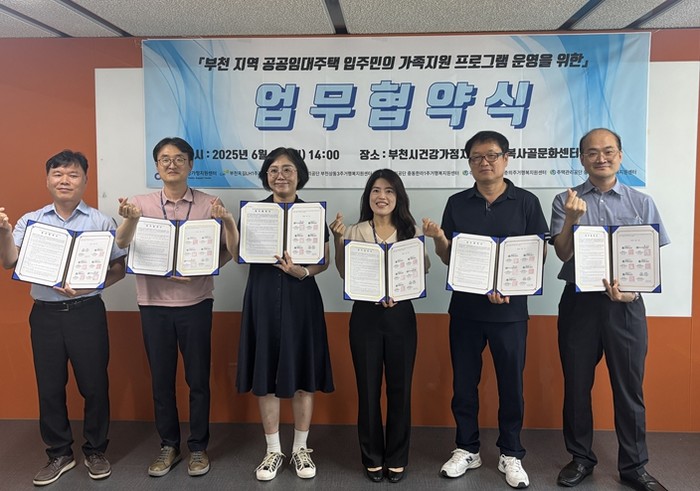 [파이낸셜경제=김기보 기자] 부천시건강가정지원센터는 2025년 6월 9일, 주택관리공단 부천춘의주거행복지원센터, 중동덕유1주거행복지원센터, 중동한라1주거행복지원센터, 부천상동3주거행복지원센터, 부천옥길LH1주거행복지원센터와 함께 '부천 지역 공공임대주택 입주민을 위한 가족지원 프로그램 운영'을 위한 업무협약(MOU)을 체결했다.
