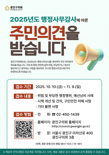 [파이낸셜경제=김예빈 기자] 광진구의회가 오는 11월 17일부터 진행되는 ‘2025년도 행정사무감사’를 앞두고 주민 의견을 10월 10일부터 11월 9일까지 총 31일간 접수한다.