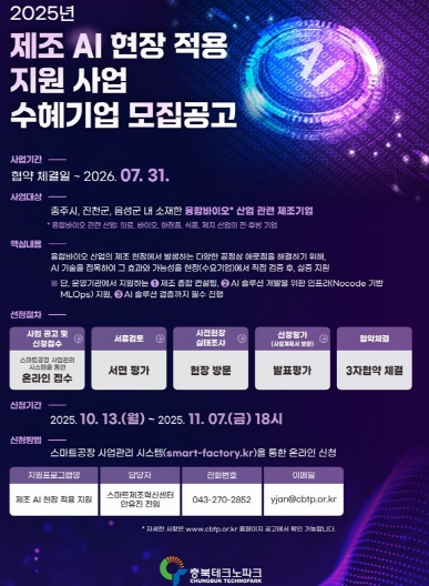 이혜란 충북도 과학기술정책과장은 “도내 융합바이오산업 제조기업의 AX(AI 전환) 추진 여건이 아직 미흡한 상황에서, 1차 모집 과정에서는 사업 취지에 부합하는 성과를 내기에는 다소 한계가 있었다”면서도, “이에 보다 가시적인 성과가 기대되는 기업을 추가 모집해 사업 효과를 높이고, 제조 현장의 AI 전환을 본격화하는 적극행정을 펼치겠다”고 말했다.
