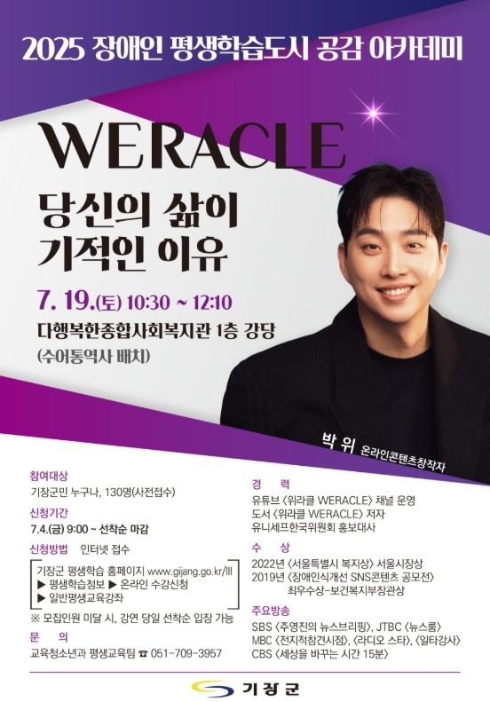 [파이낸셜경제=박영진 기자] 기장군은 오는 19일 오전 10시 30분 다행복한종합사회복지관 1층 강당에서‘2025 장애인 평생학습도시 공감 아카데미’ 강연을 개최한다고 9일 밝혔다.