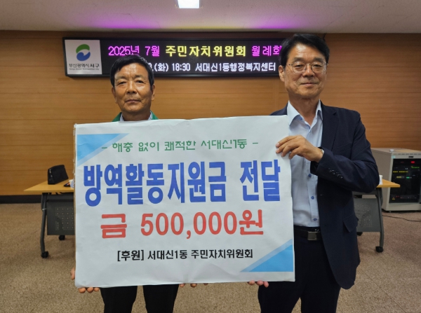 [파이낸셜경제=박영진 기자] 부산광역시 서구 서대신1동 주민자치위원회(위원장 정종영)는 지난 8일, 해충 없는 쾌적한 마을 조성을 위하여 서대신1동 주민자율방역단(새마을지도자협의회)에 방역활동지원금 50만원을 전달했다.