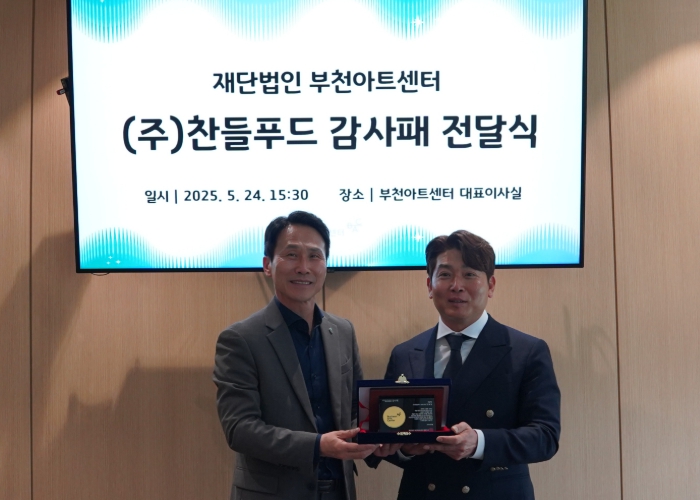 [파이낸셜경제=김기보 기자] 재단법인 부천아트센터는 지난 5월 24일, (주)찬들푸드 정재영 대표이사에게 문화예술 발전에 기여한 공로를 인정해 감사패를 전달했다. 정재영 대표가 부천 지역 문화예술의 저변 확대와 공공예술기관 활성화를 위한 기부에 적극적으로 참여한 데 대한 감사의 뜻을 담아 수여된 것이다.