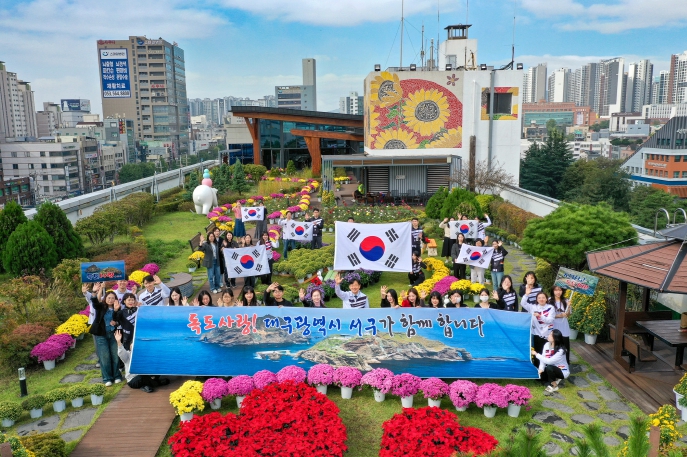 서구청은 10월 24일, 국화로 가득한 서구청 옥상 생태공원에서 ‘독도 사랑 퍼포먼스’를 개최했다. 이날 행사에서 독도 사랑 티셔츠를 입은 직원들은 태극기와 현수막을 흔들며 한마음으로 독도를 사랑하는 마음과 수호 의지를 표현했다.