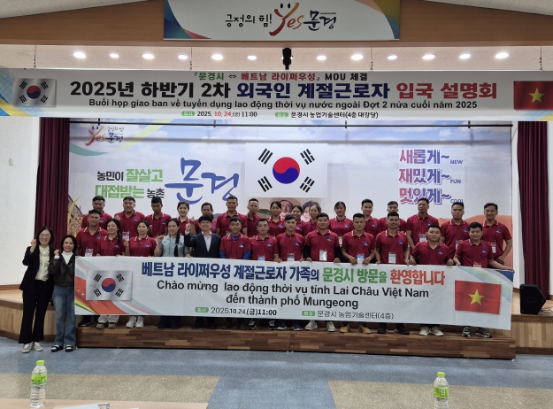 [파이낸셜경제=김지훈 기자] 문경시는 10월 24일 외국인 계절근로자 28명과 관내 농업인이 참여한 가운데 농업기술센터에서 2025년 하반기 2차 외국인 계절근로자 입국설명회를 개최했다.